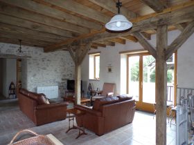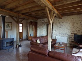 Poêle à bois au milieu du salon, TV, DVD, Wifi et Téléphone.